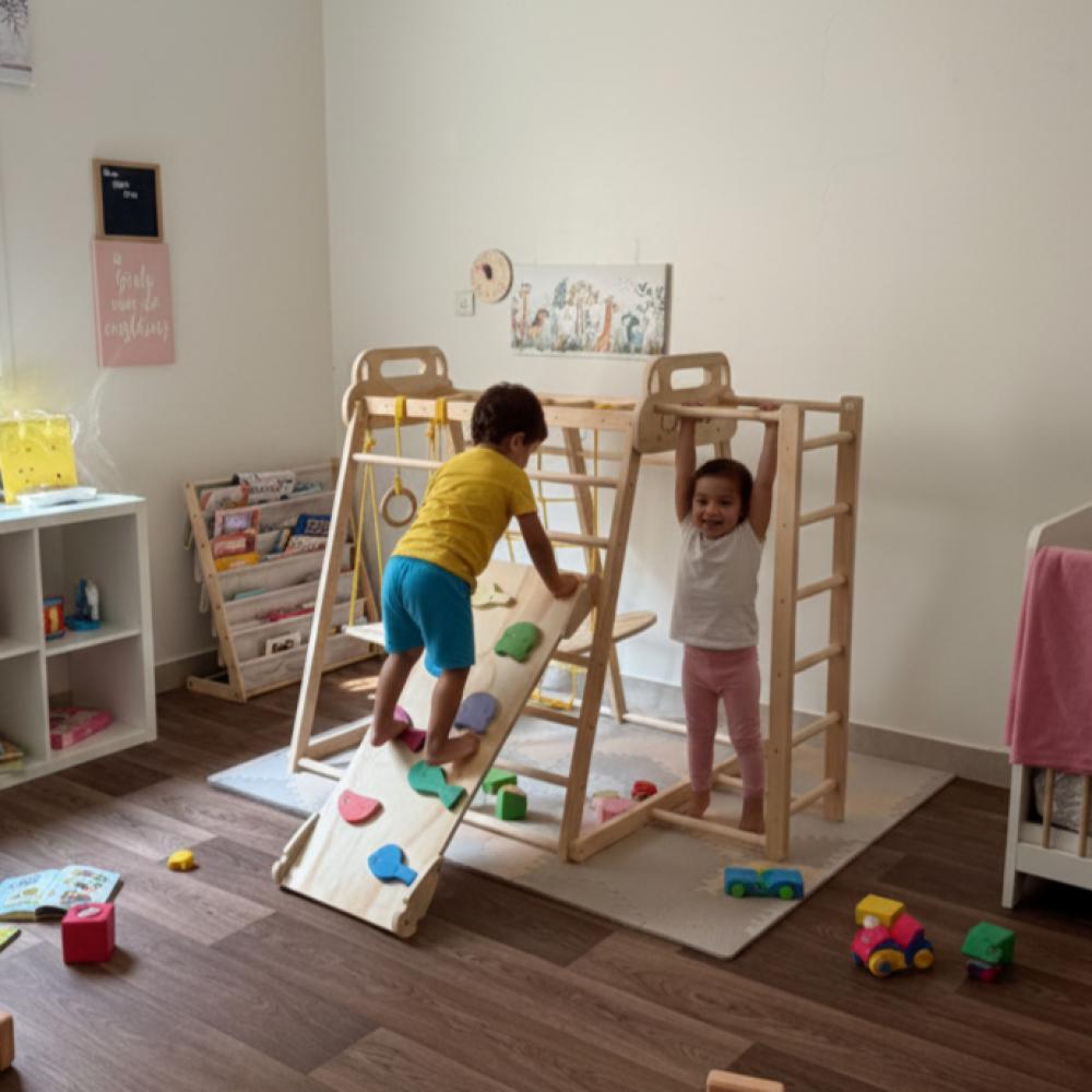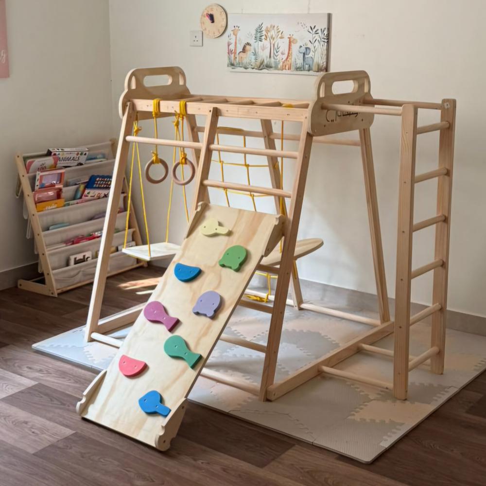 مجموعة الألعاب الخشبية الداخلية للأطفال – الإصدار الجديد 2025 (زحليقة، تسلق، أرجوحة متعددة الأنشطة)