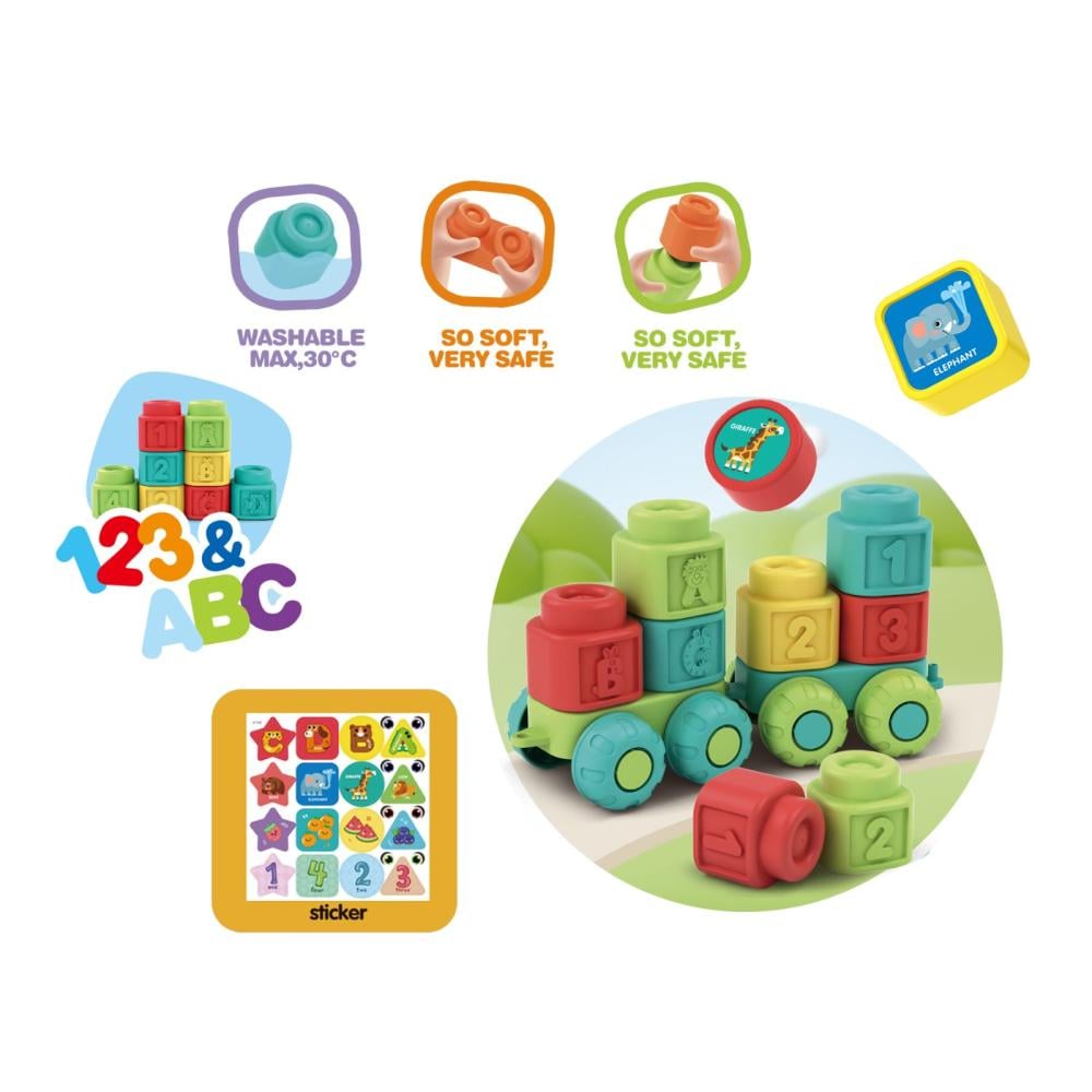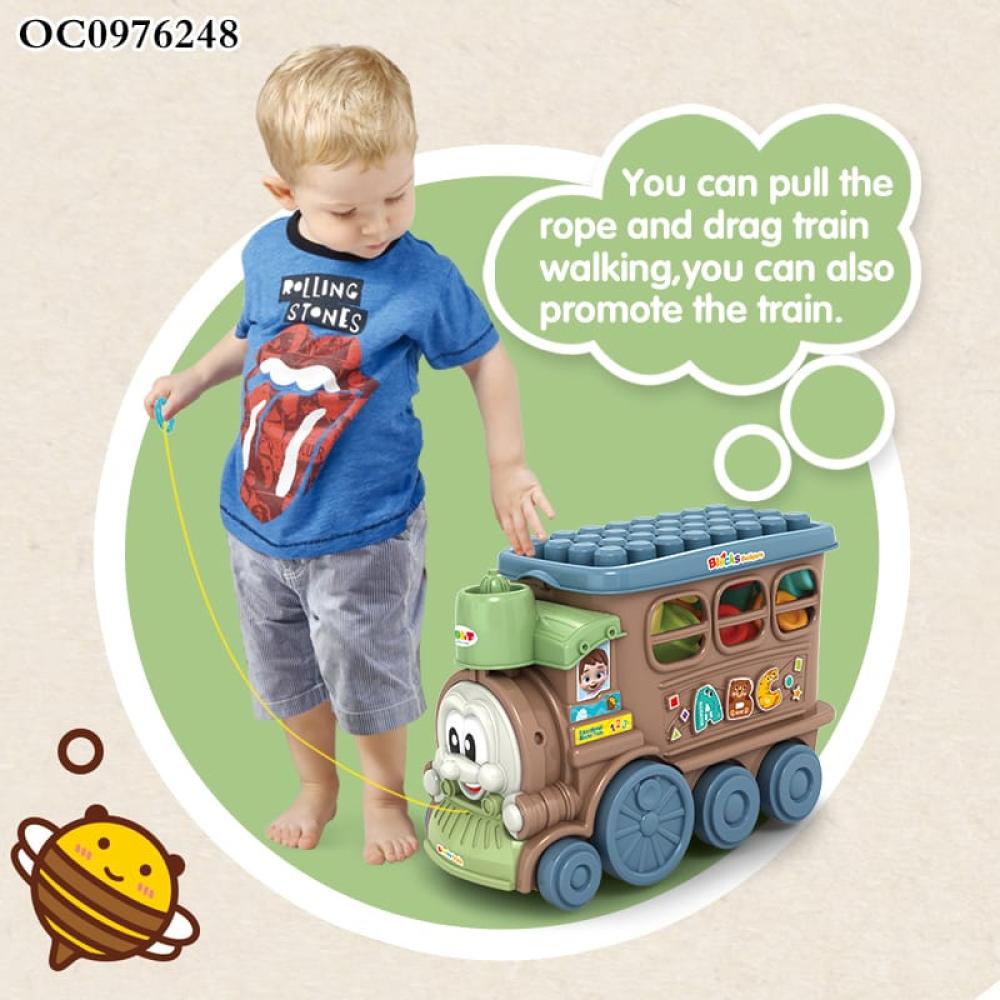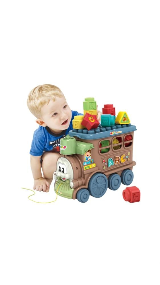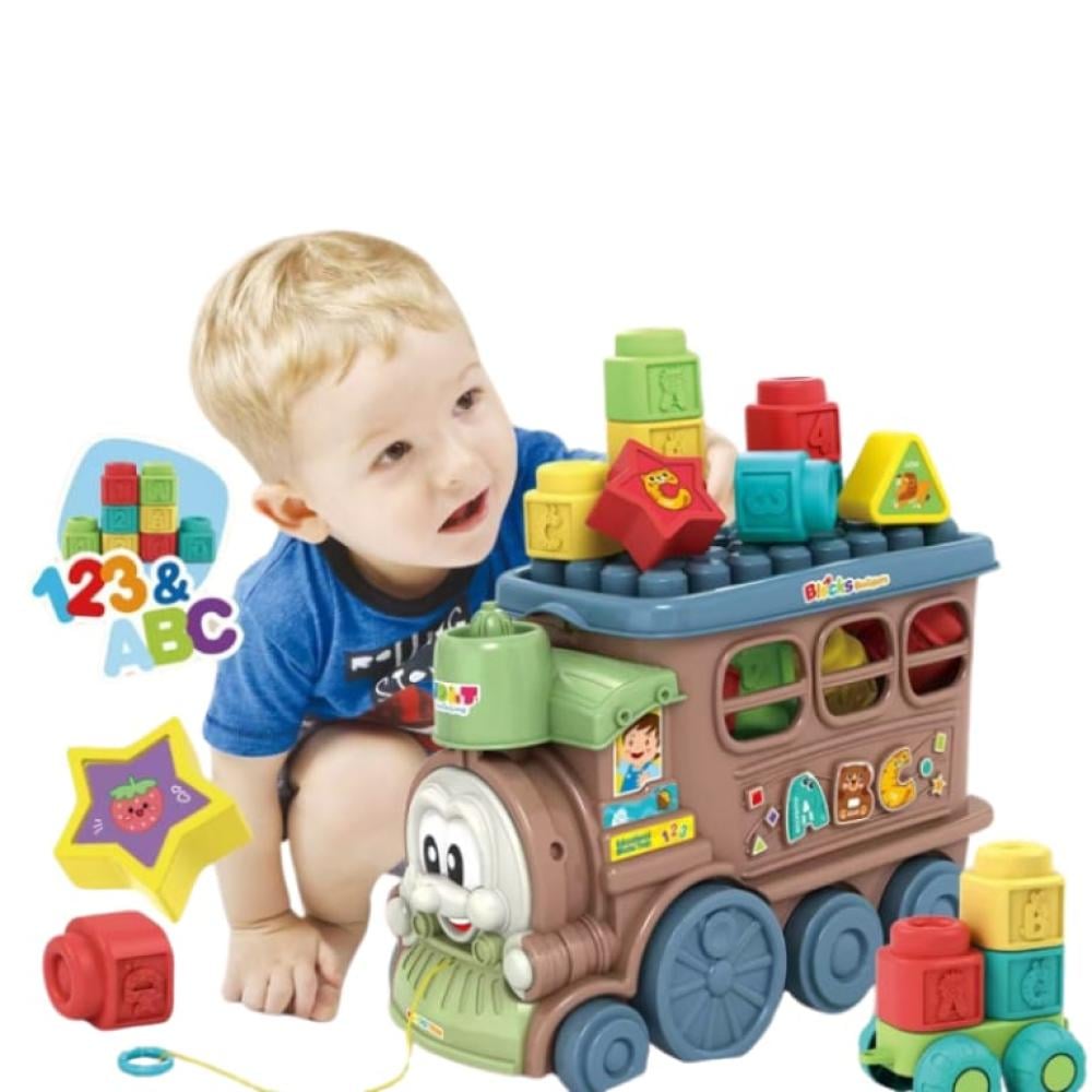 ويحتوي على مجموعة من الأشكال الهندسية مثل المكعبات والأسطوانات والمثلثات بألوان زاهية (أحمر، أخضر، أصفر، أزرق). اللعبة مصممة لتطوير مهارات الطفل الحركية والتنسيق بين اليد والعين، بالإضافة إلى تعزيز التعرف على الأشكال والألوان. يمكن سحب القطار باستخدام الحبل المرفق، كما يمكن ترتيب الأشكال أو إدخالها في فتحات مخصصة، مما يجعلها مثالية للعب التخيلي والتعلم المبكر.