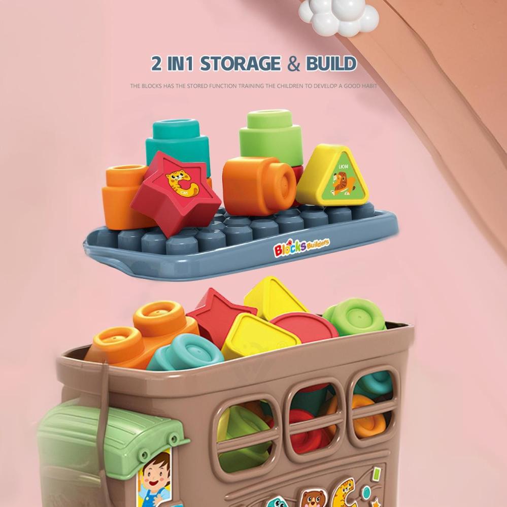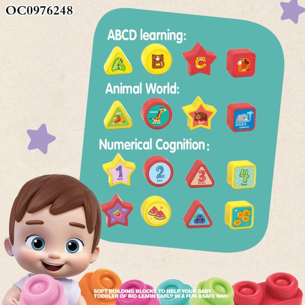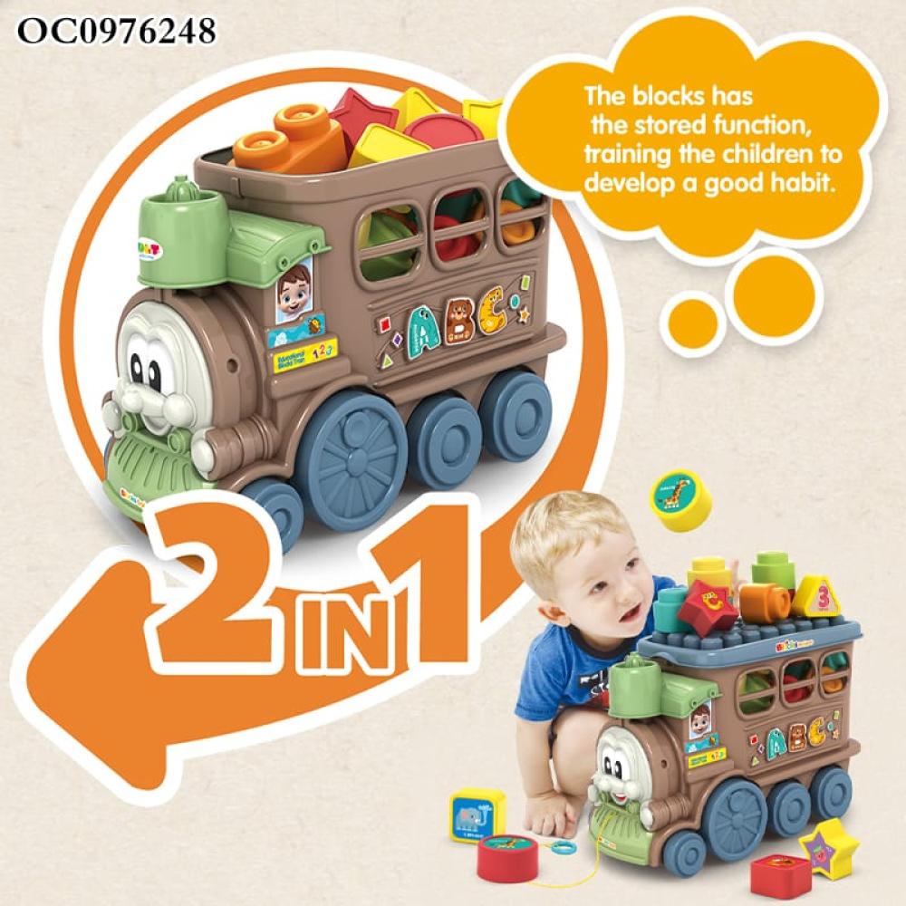 ويحتوي على مجموعة من الأشكال الهندسية مثل المكعبات والأسطوانات والمثلثات بألوان زاهية (أحمر، أخضر، أصفر، أزرق). اللعبة مصممة لتطوير مهارات الطفل الحركية والتنسيق بين اليد والعين، بالإضافة إلى تعزيز التعرف على الأشكال والألوان. يمكن سحب القطار باستخدام الحبل المرفق، كما يمكن ترتيب الأشكال أو إدخالها في فتحات مخصصة، مما يجعلها مثالية للعب التخيلي والتعلم المبكر.