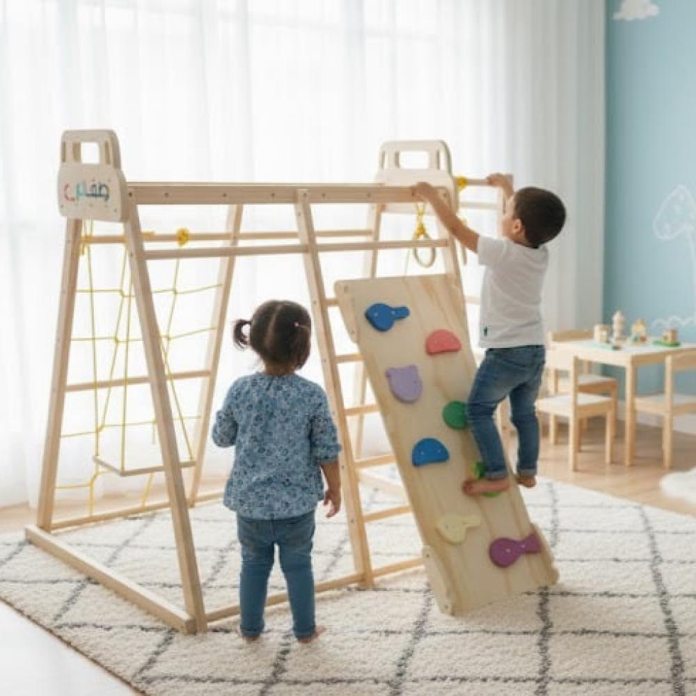 تتكوّن المجموعة من زحليقة خشبية ناعمة، وحبال تسلق، وشبكة مرنة، وأرجوحة لطيفة، وحلقات جمباز، لتقدّم تجربة لعب متكاملة تحفّز حركة الطفل، وتطوّر توازنه وقوته العضلية بطريقة ممتعة.